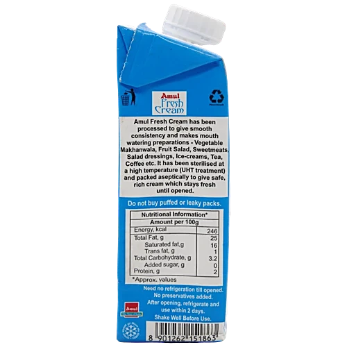 Amul Fresh Cream has been processed to give a smooth consistency and makes mouth-watering preparations. Amul fresh cream is sterilised at high temperature and packed aseptically to give safe, rich cream which stays fresh until opened. Made of fresh & pure milk cream. Available in two convenient packs. No preservatives added.