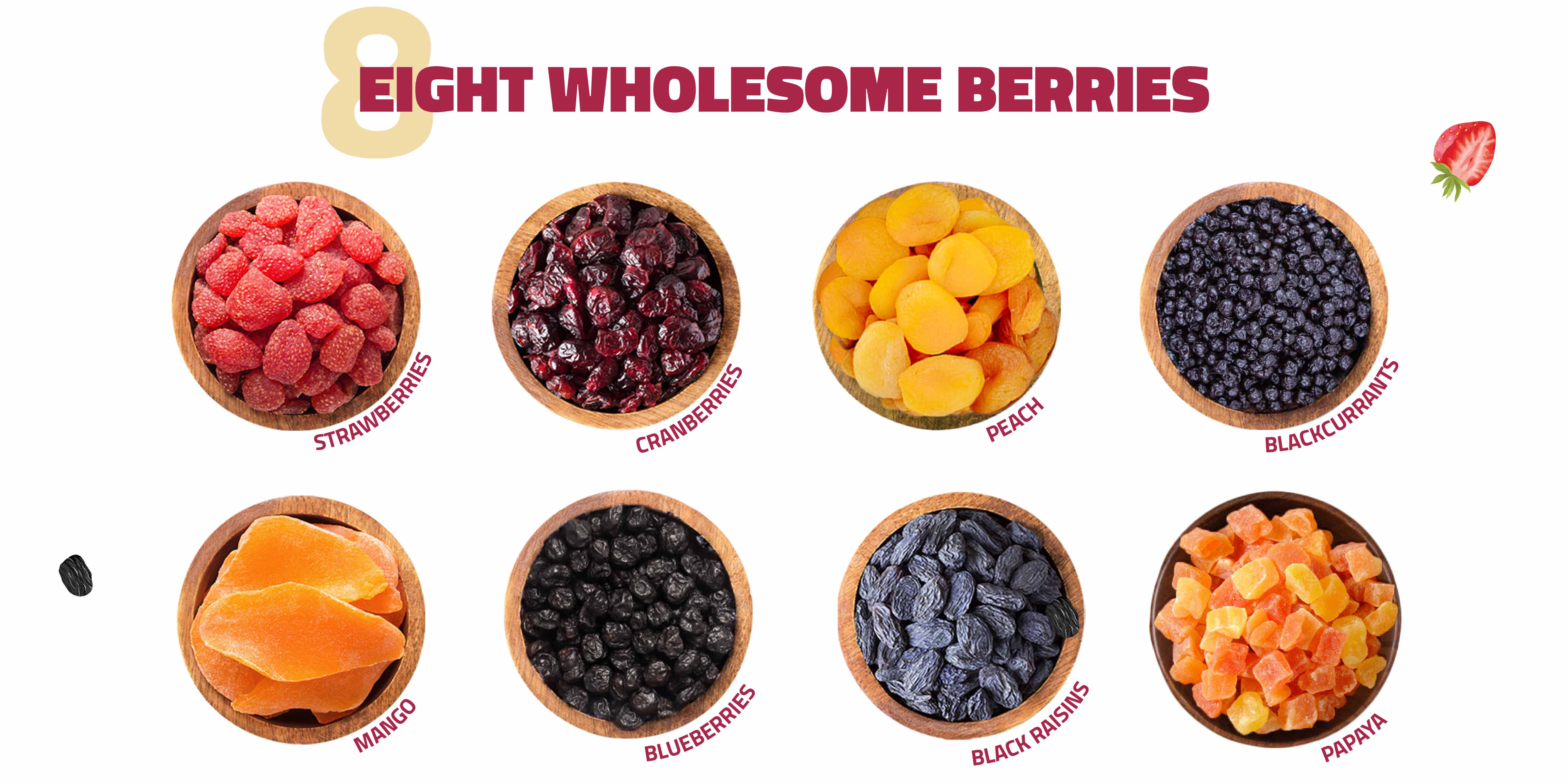 Dried Cranberries, Dried Black Currants, Black Raisins, Dried Mangoes, Dried Strawberries, Dried Peach, Dried Papaya, Dried Blueberries, Cane Sugar