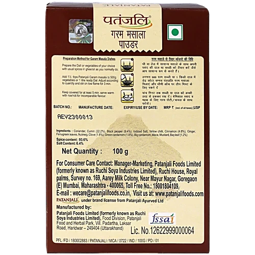 Patanjali Garam Masala Powder is a harmonious fusion of the finest ingredients, each contributing its unique flavour profile to create a symphony of taste. The warm and earthy notes of cumin, coriander, and cardamom are delicately balanced with the subtle sweetness of cinnamon and cloves, while the piquant kick of black pepper adds a tantalising zest to every dish.